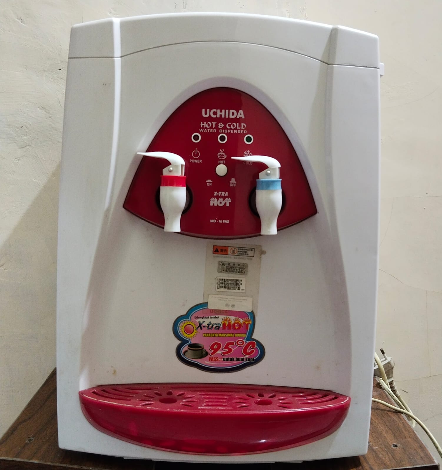 Dispenser Merk Uchiba, yang dapat diletakkan diatas meja di kitchen set atau di ruangan keluarga. Bisa panas dan dingin, jadi sangat cocok untuk membuat teh atau kopi saat bersantau bersama keluarga.